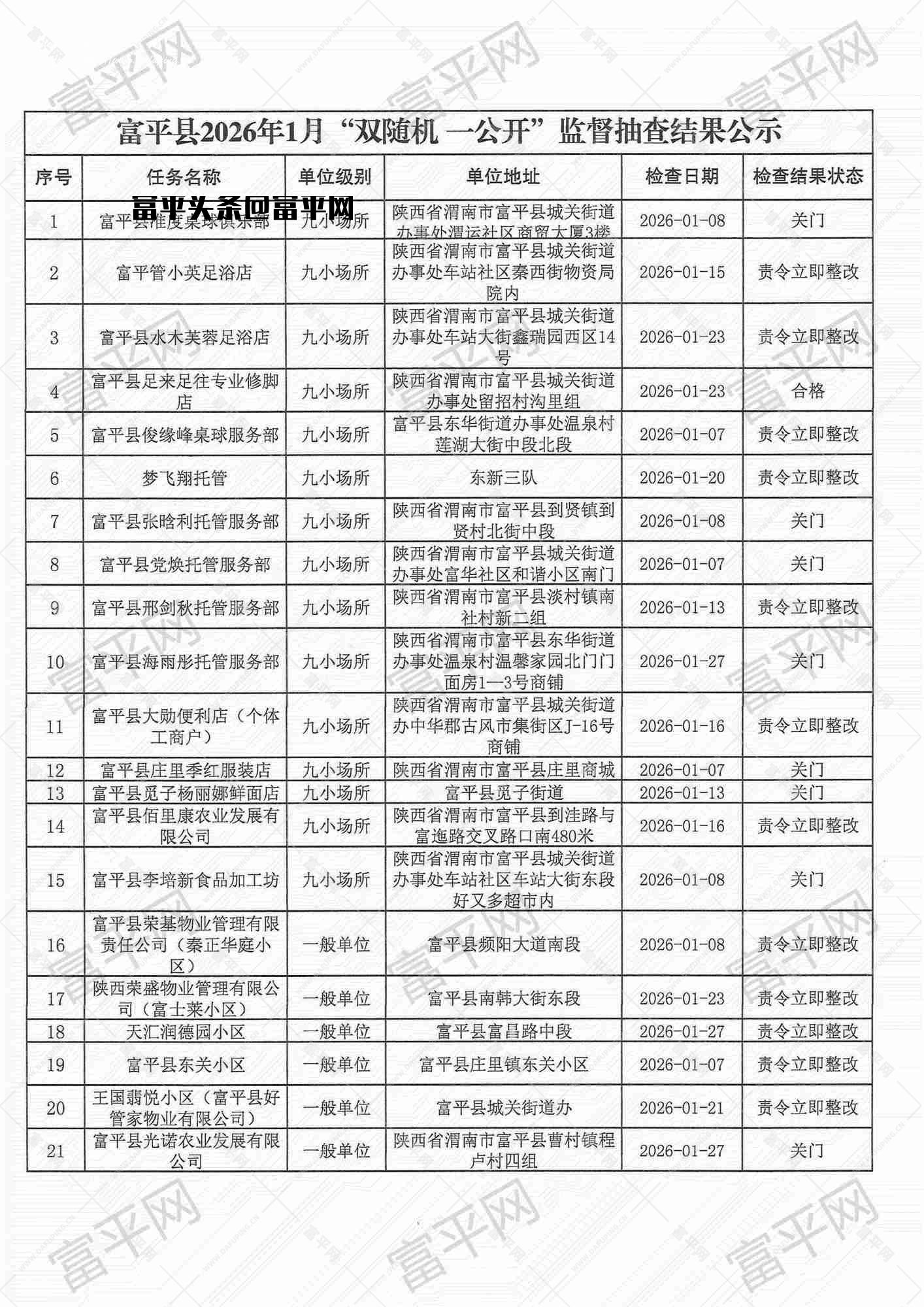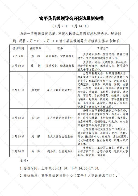 富平县县级领导公开接访最新安排(2月9日—2月14日)来源:富平信访局 [详细]