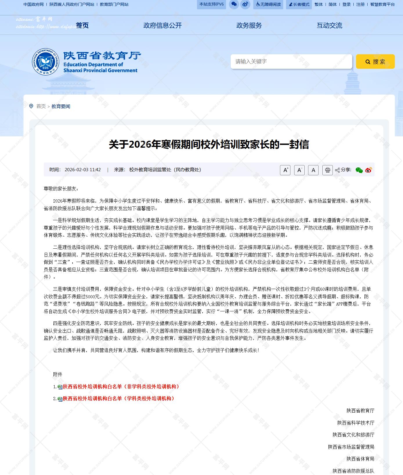 2月3日陕西省教育厅等六部门联合发布关于2026年寒假期间校外培训致家长的一封信公布了