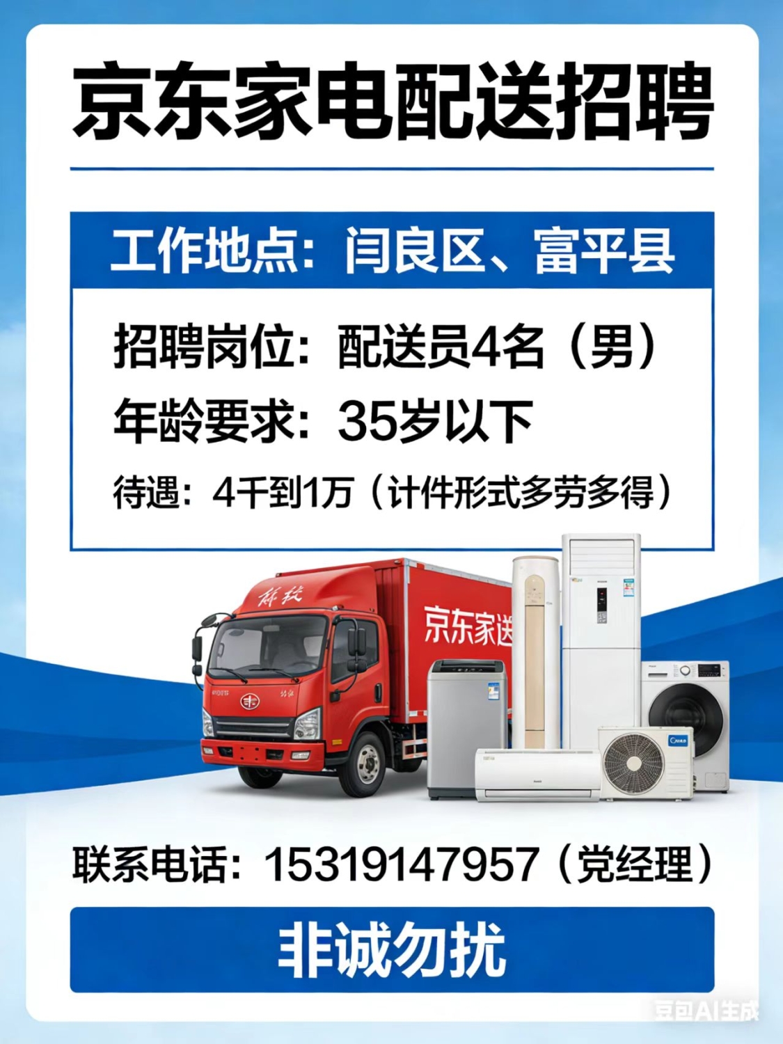招聘阎良区,富平县京东家电配送,招聘配送员4名(男)35岁以下。待遇4千到...